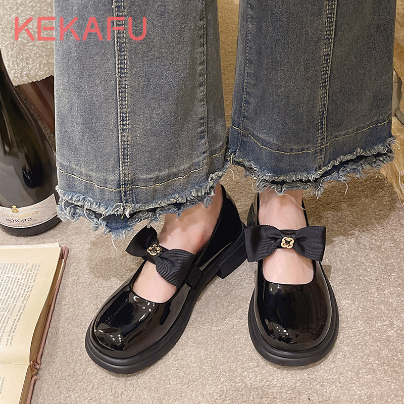 珂卡芙玛丽珍女鞋2023年秋季新款低跟一脚蹬蝴蝶结配裙子小皮鞋潮