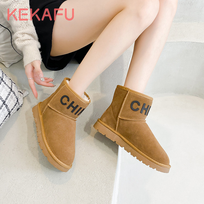 珂卡芙真皮雪地靴女2022年冬季新款超厚绒防滑字母面包鞋棉鞋女鞋