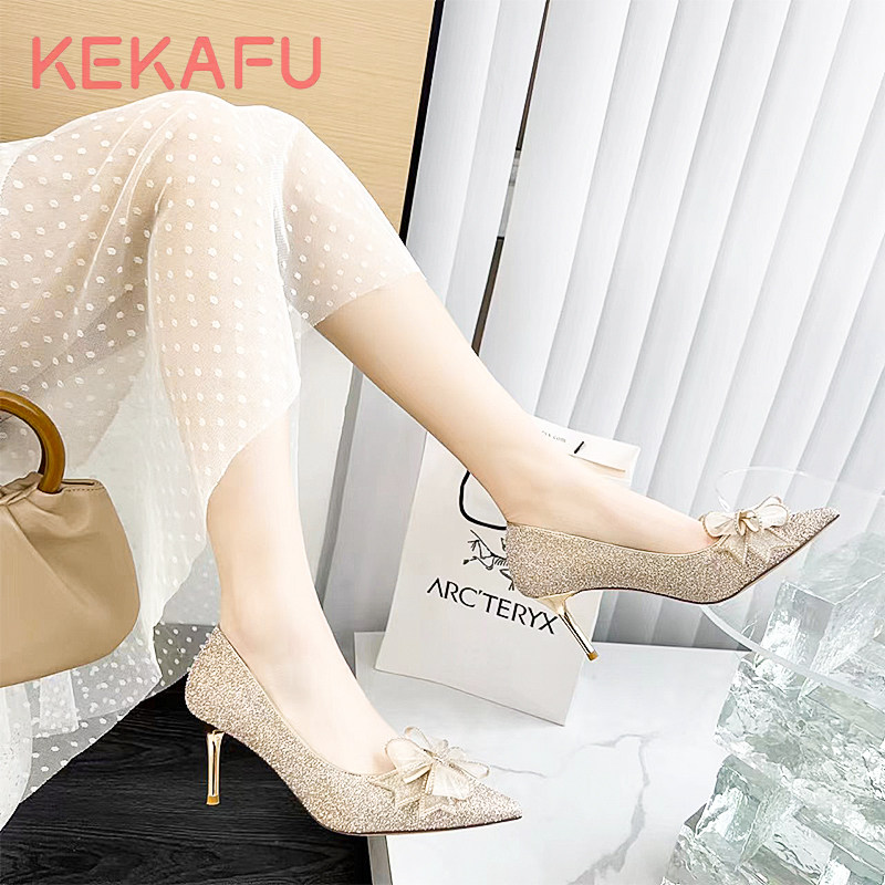 珂卡芙高跟鞋女2023年春季新款尖头细高跟格利特蝴蝶结婚鞋单鞋潮