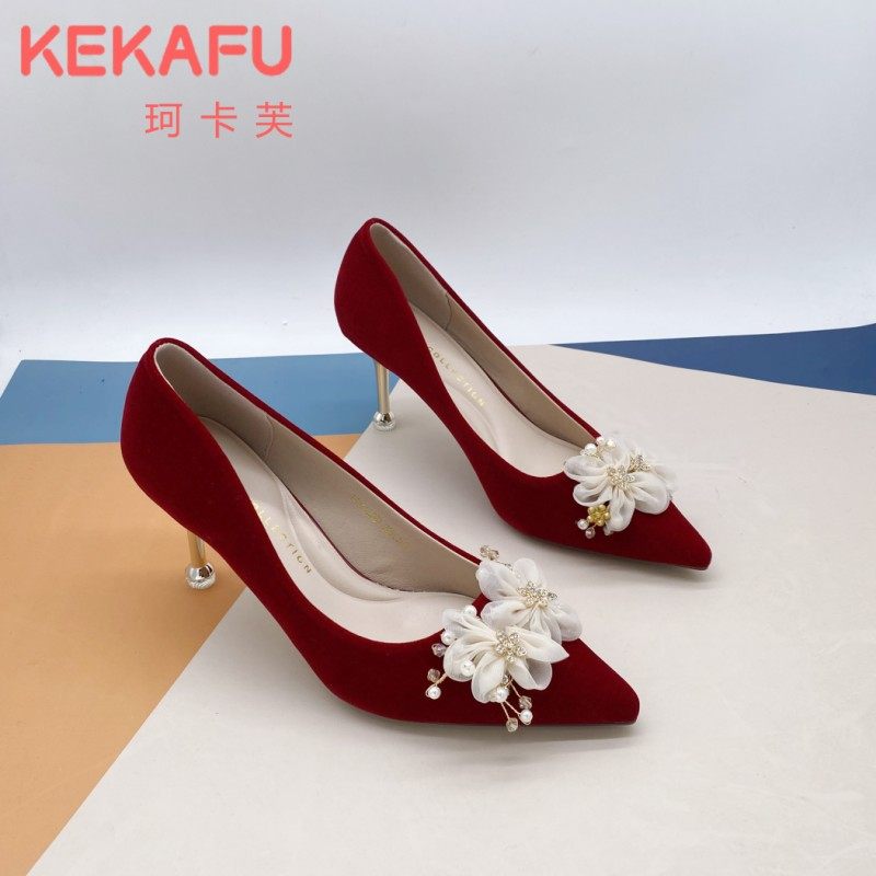 珂卡芙2024春季新款珠子花朵新娘婚鞋女细跟不累脚婚纱高跟女单鞋