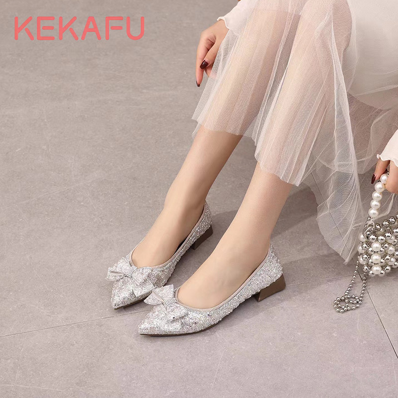 珂卡芙软底单鞋女2023年春季新款尖头亮晶晶蝴蝶结仙女风优雅婚鞋