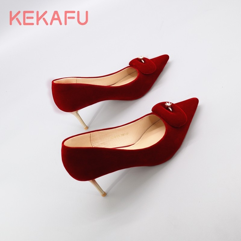 珂卡芙2024春季新款蝴蝶结高跟丝绒婚鞋新娘法式尖头细跟商场同款