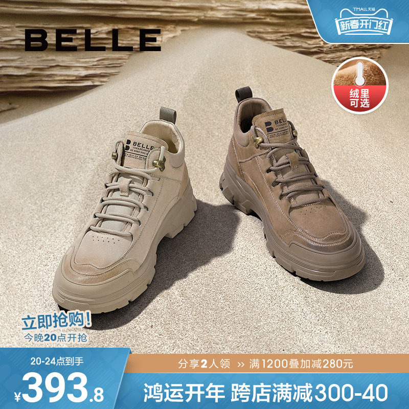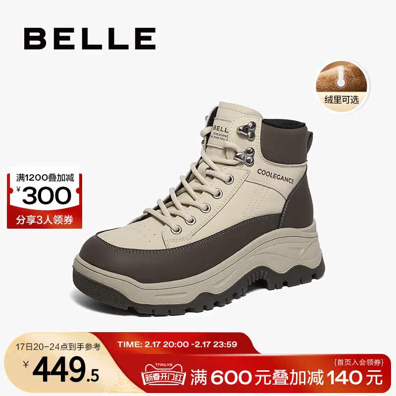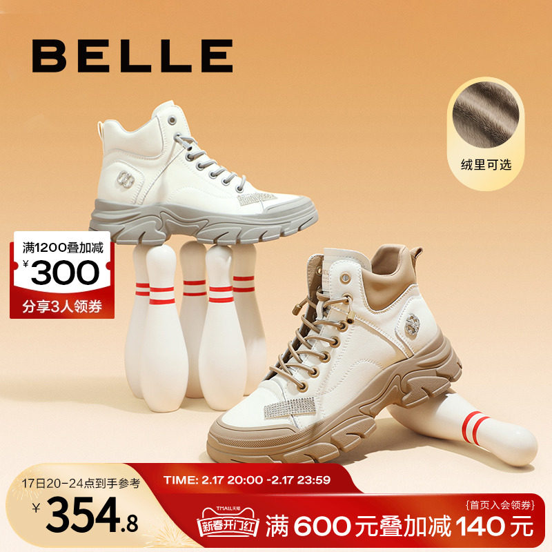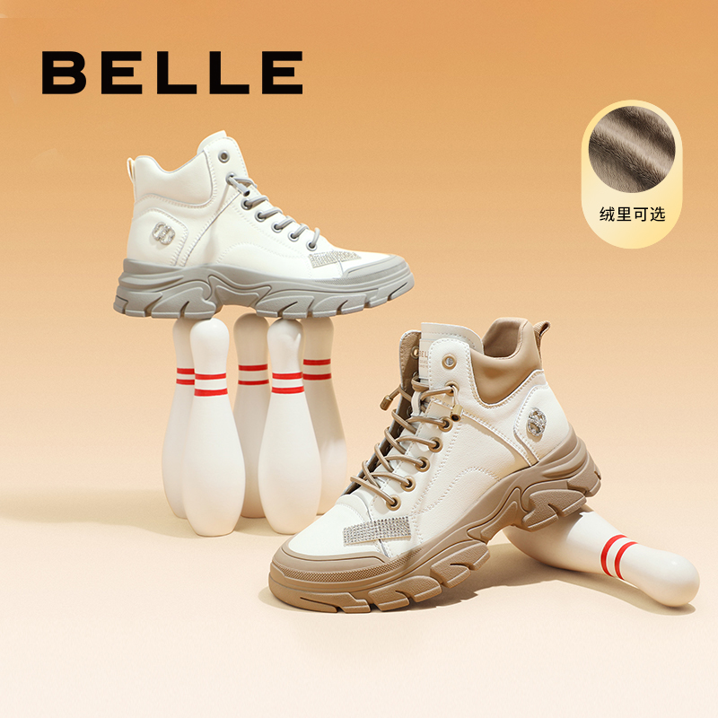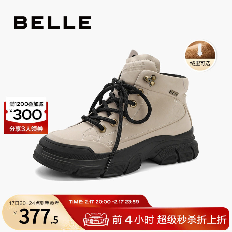 百丽工装靴2023冬季新款加绒女鞋子高帮厚底运动休闲板鞋A3C1DDM3