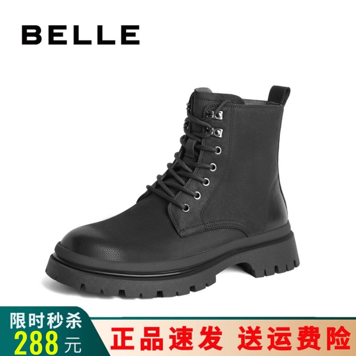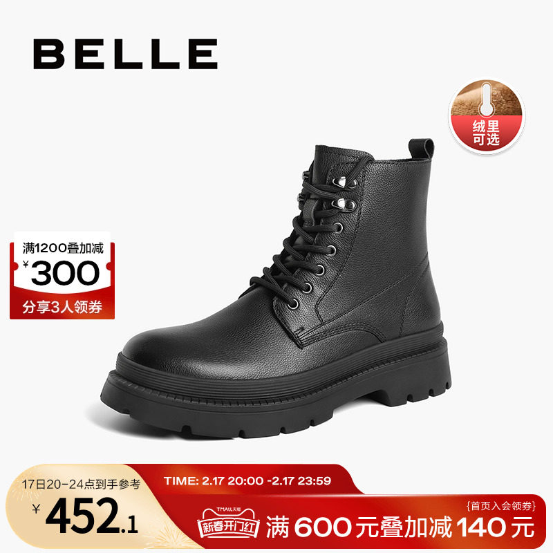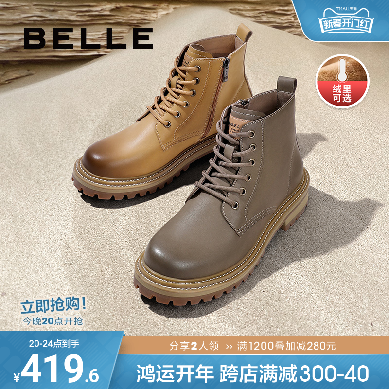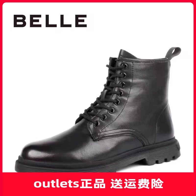 Belle/百丽工装鞋男2023冬季靴子加绒拉链马丁靴真皮男靴高帮鞋