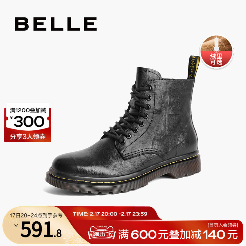 百丽高帮马丁靴男鞋冬季商场同款牛皮工装靴子男士加绒鞋8CM01DD3