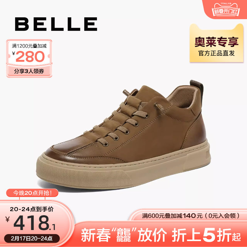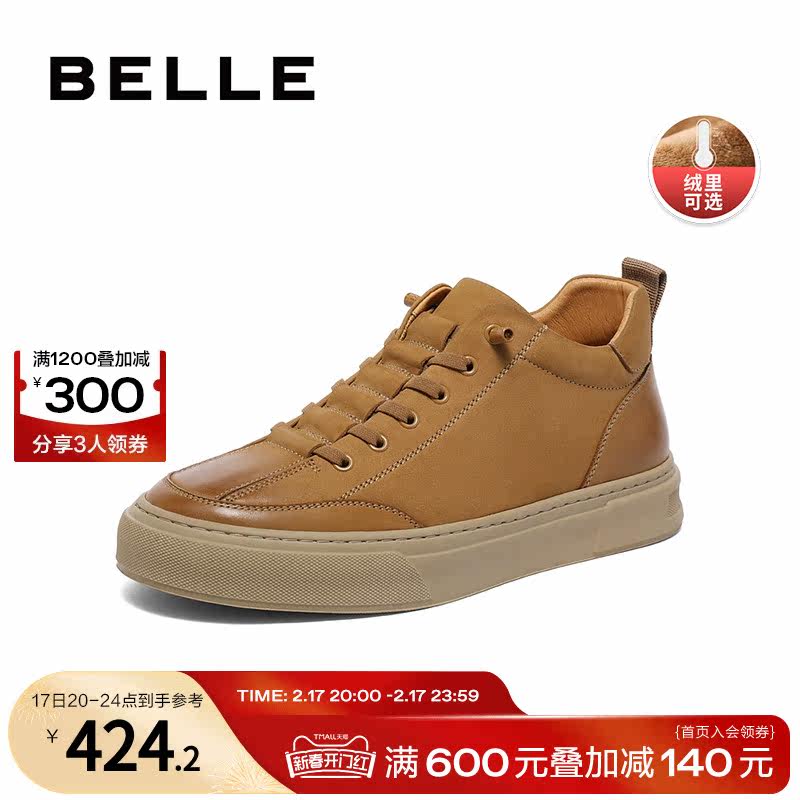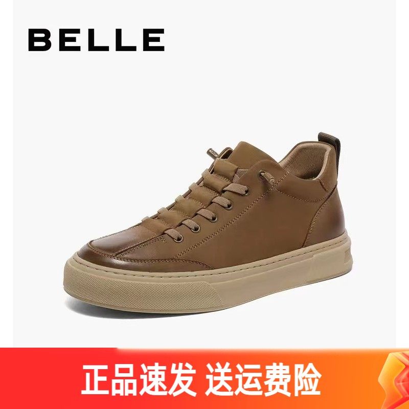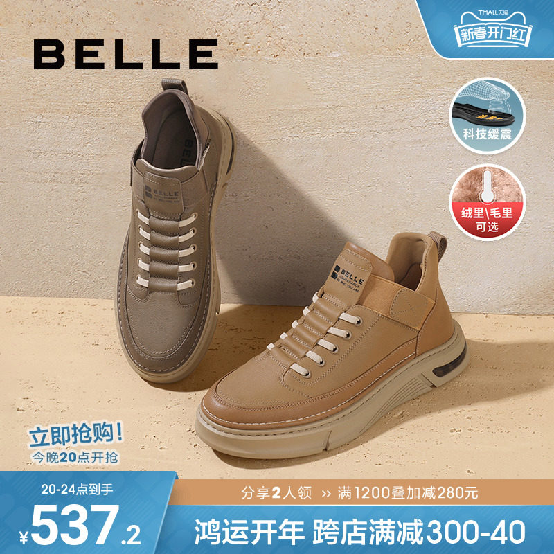 百丽休闲鞋高帮男鞋2023秋冬季牛皮擦色板鞋加绒工装靴子A1255DD3