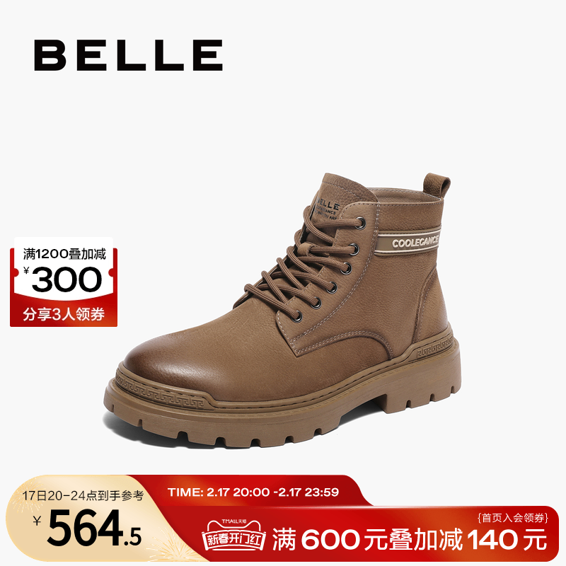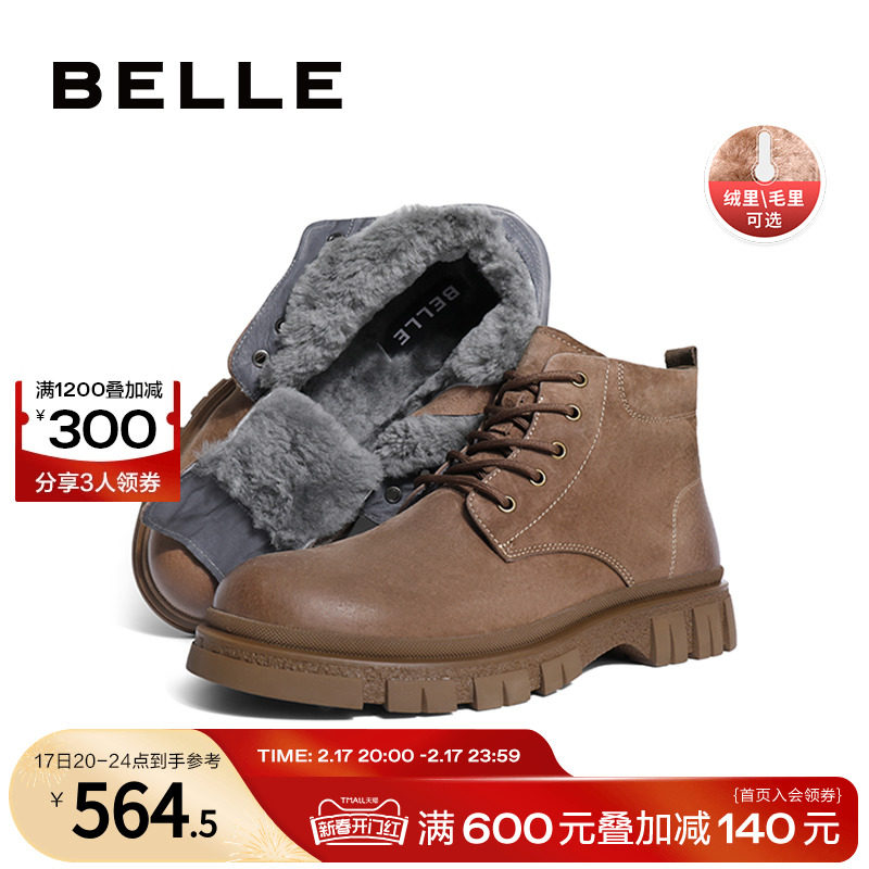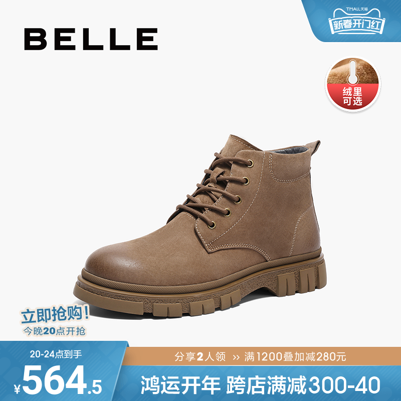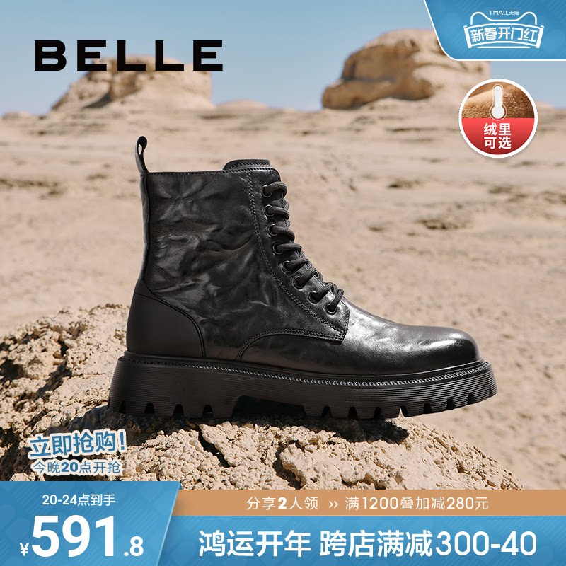 百丽休闲鞋子男靴冬季商场同款牛皮户外工装靴加绒马丁靴8FT01DD3