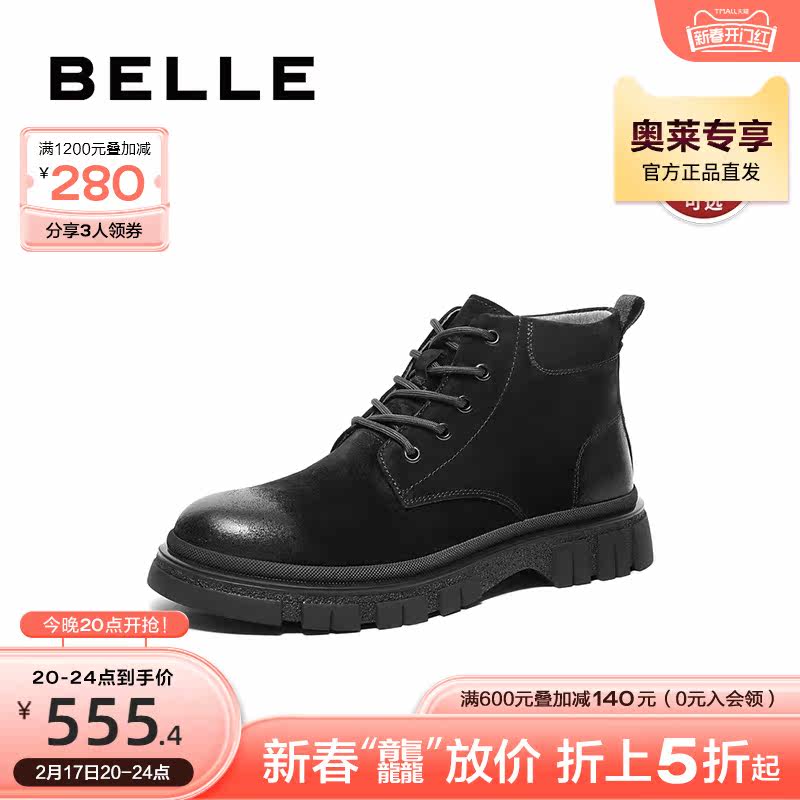 百丽休闲靴男鞋冬季新款牛皮增高厚底工装马丁靴加绒A1330DD3