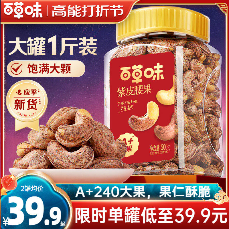百草味紫皮腰果仁大颗粒500g新年货越南带皮盐焗坚果腰果休闲零食