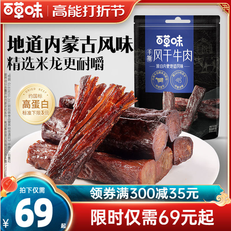 百草味风干牛肉500g原味内蒙古风味手撕牛肉干解馋露营小零食
