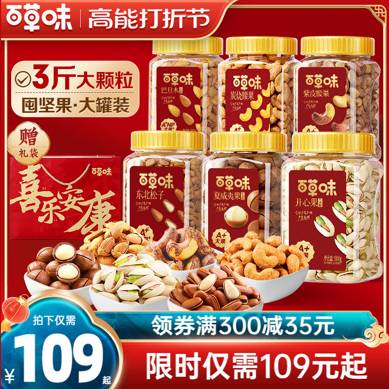 百草味3罐装坚果1500g年货坚果礼盒手剥干果零食大礼包节日送礼
