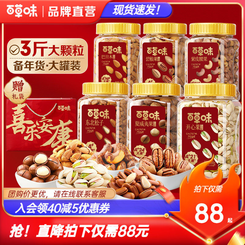 百草味3罐装纯坚果1500g年货干果大礼包松子开心果腰果年货送礼盒