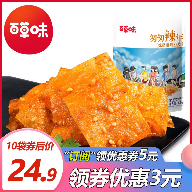 【百草味麻辣豆皮65gx10/5/2袋】网红辣条手撕辣片豆干儿时零食