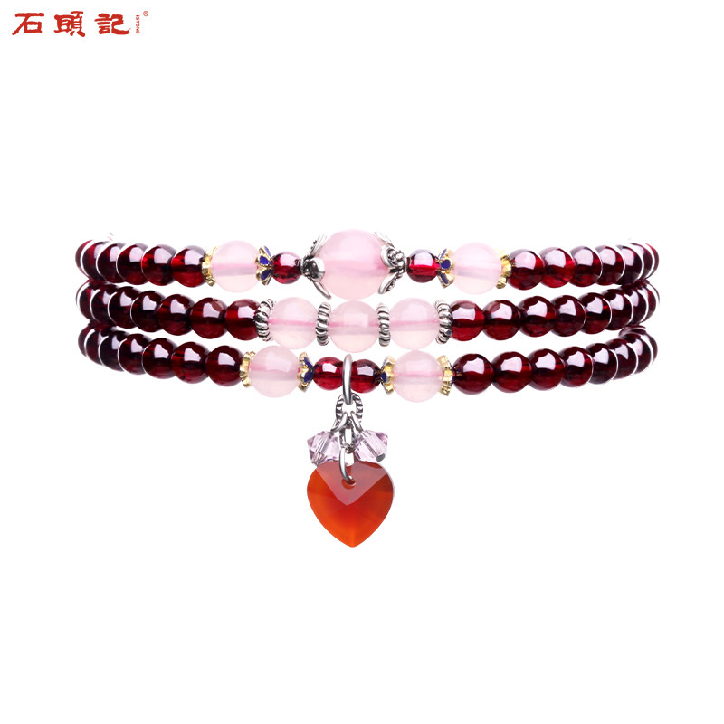 石头记天然酒红石榴石手链粉晶手串蓝玉髓珠链925银配饰