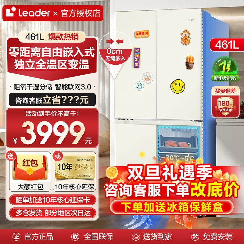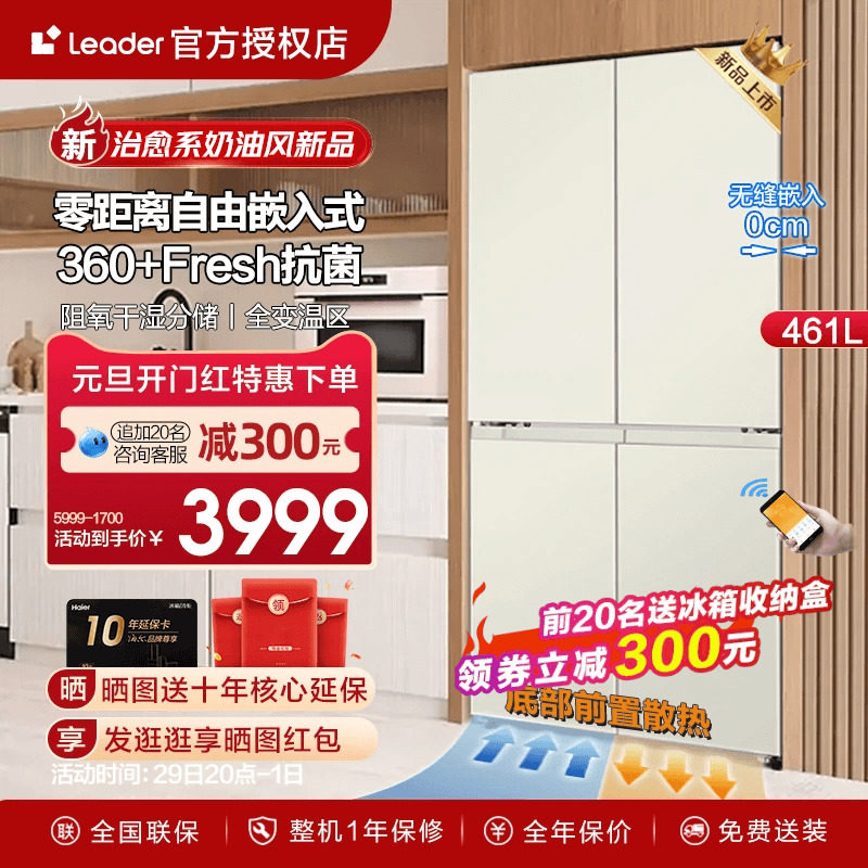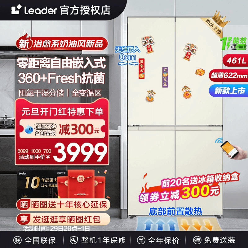 新品】海尔统帅461升零嵌式白色超薄电冰箱家用十字四开门无霜
