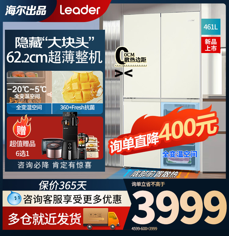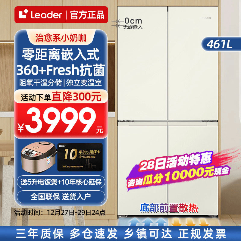 【询单必降】海尔统帅461升白色超薄零嵌式电冰箱底部散热十字门