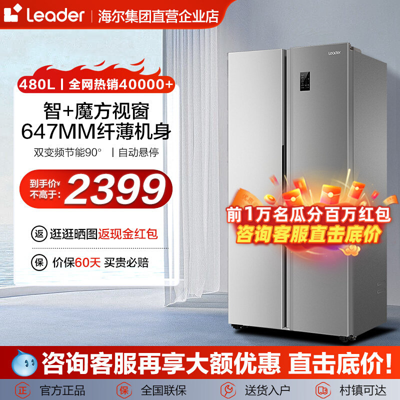 海尔冰箱统帅475/478L家用超薄十字对开门风冷无霜变频节能大容量