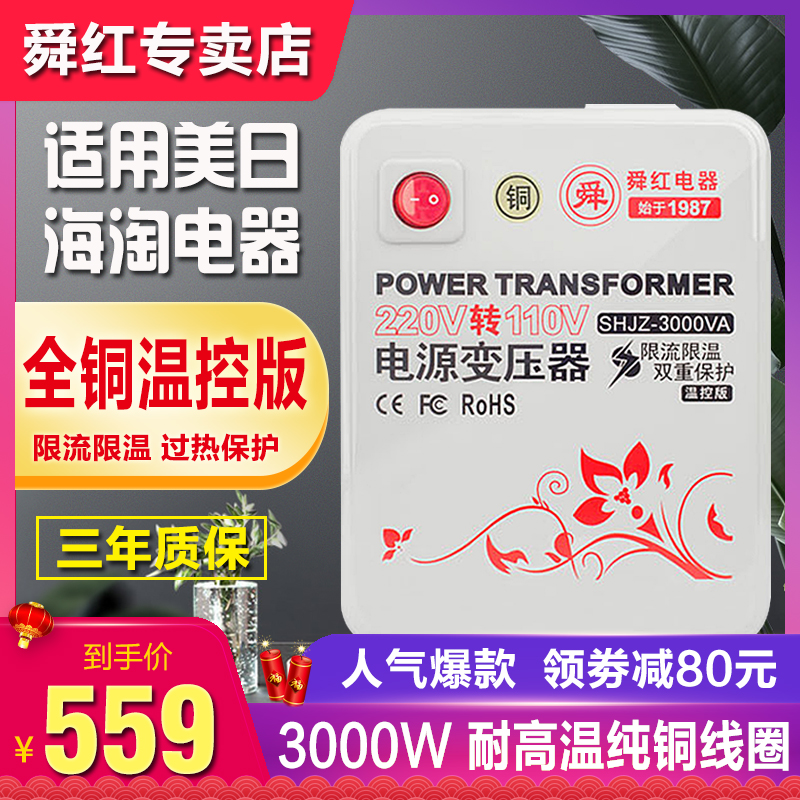 美日电饭锅电吹风咖啡机料理机用变压器220V转110V 3000W 舜红