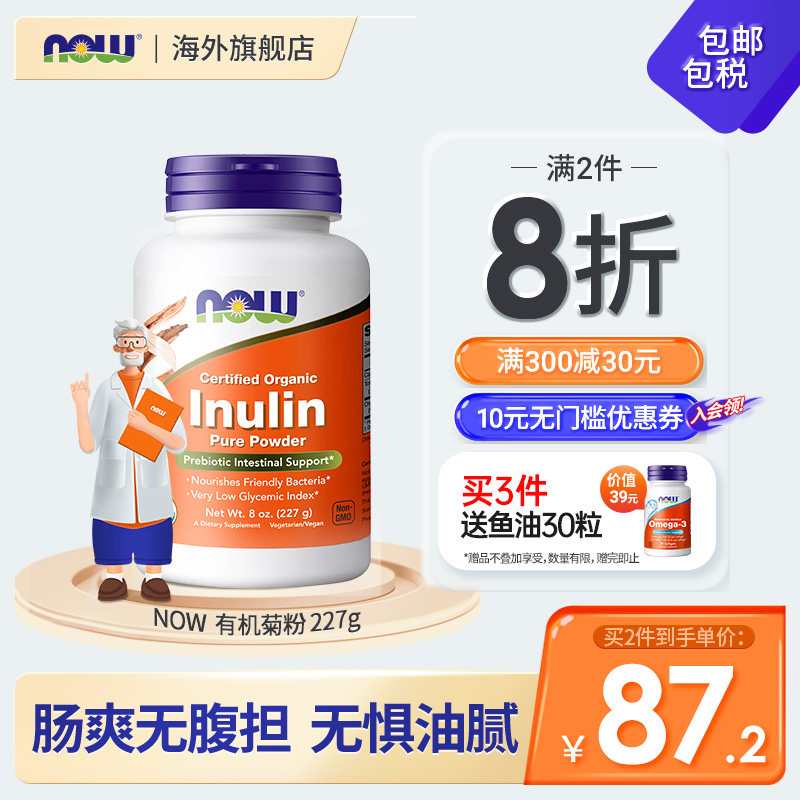 NOW Foods诺奥有机纯菊粉低聚果糖益生元菌大人健康肠胃膳食纤维