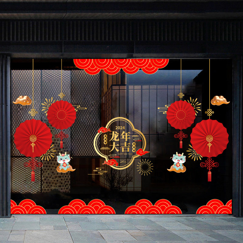 2024龙年新年快乐墙贴画店铺橱窗玻璃贴纸静电窗贴装饰品场景布置