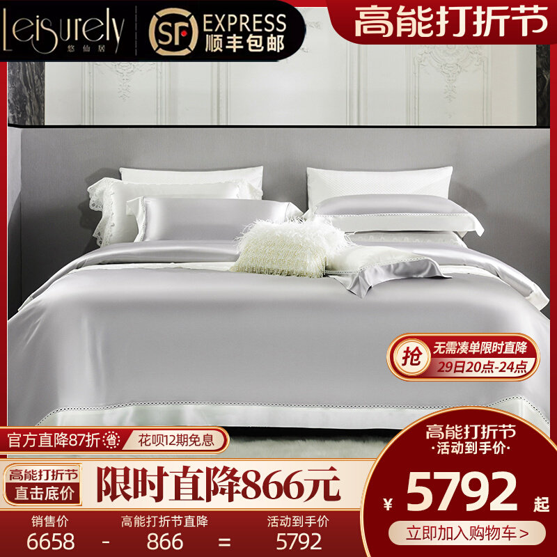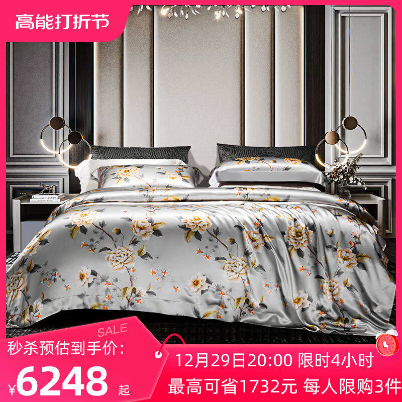 高端28姆米真丝四件套100%桑蚕丝银色花卉被套床单笠丝绸床上用品