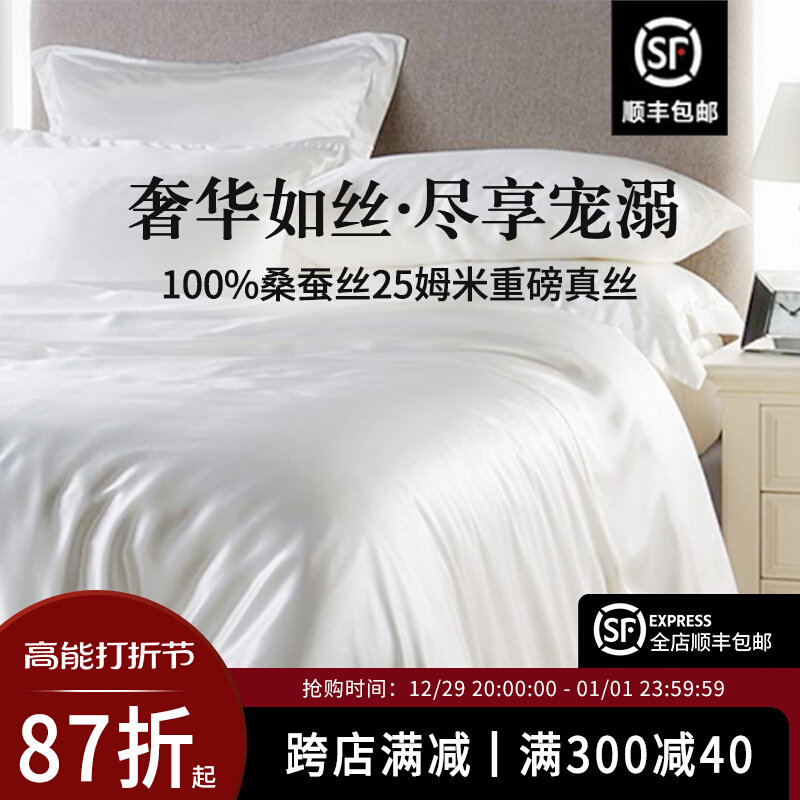 坤霏诺亚100%桑蚕丝25姆米重磅双面真丝四件套白色银色丝绸被套
