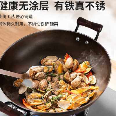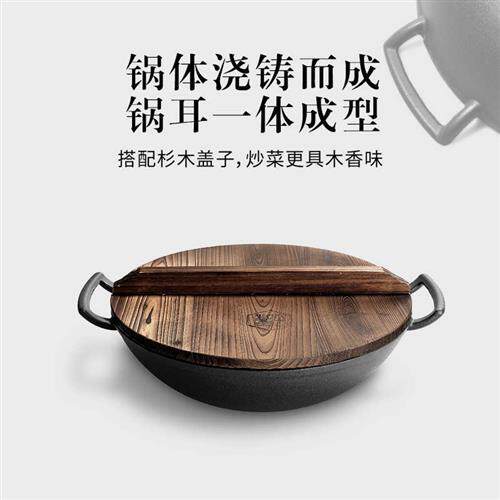 铸味铸铁锅真无涂层炒菜锅少油烟燃气灶不粘锅家用炒锅双耳铁锅