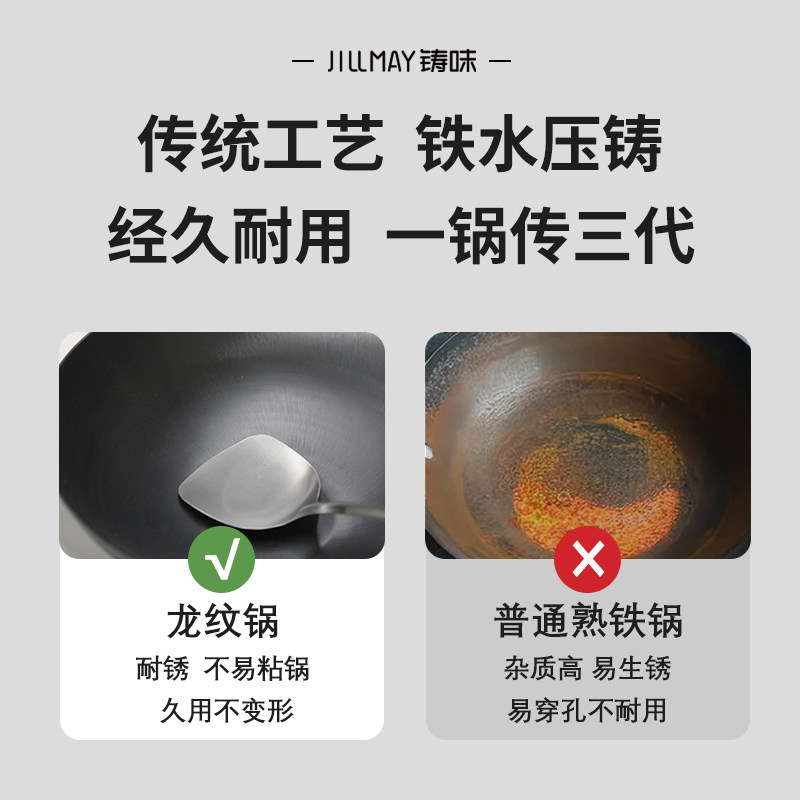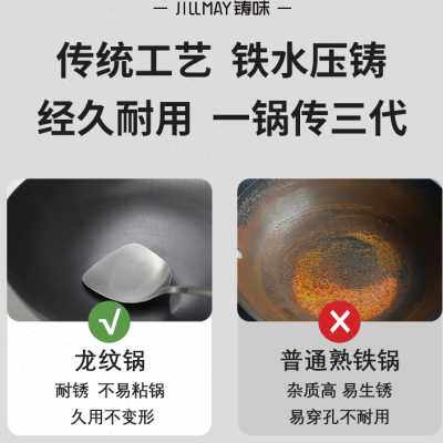 铸味双铁锅铸耳铁锅家真不锈龙纹圆底加加厚无涂层不粘深锅用炒锅