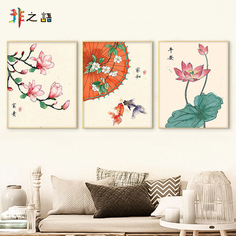 非之语 数字油画diy填充涂色新中式国风手绘三拼联客厅装饰油彩画