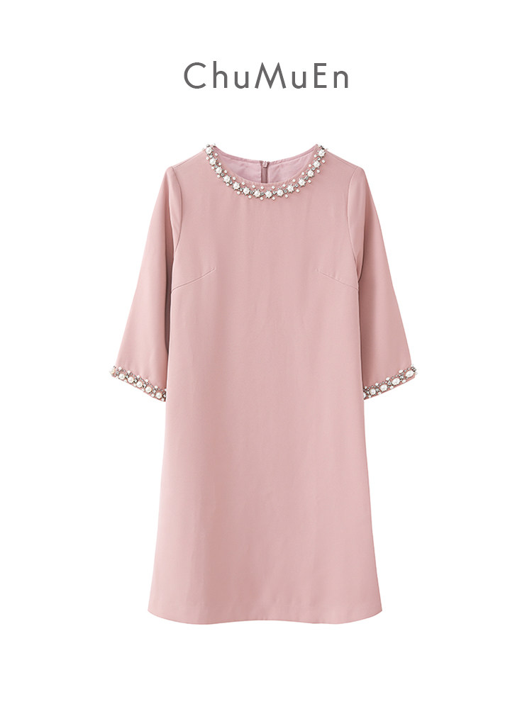 遇见音儿缘2023秋季新款法式优雅圆领钉珠装饰七分袖粉色连衣裙女
