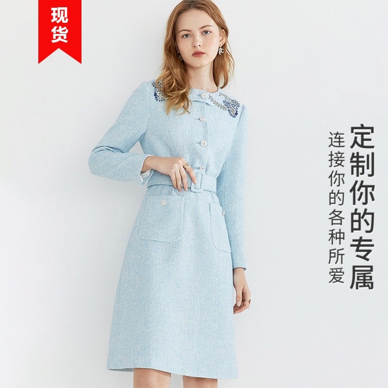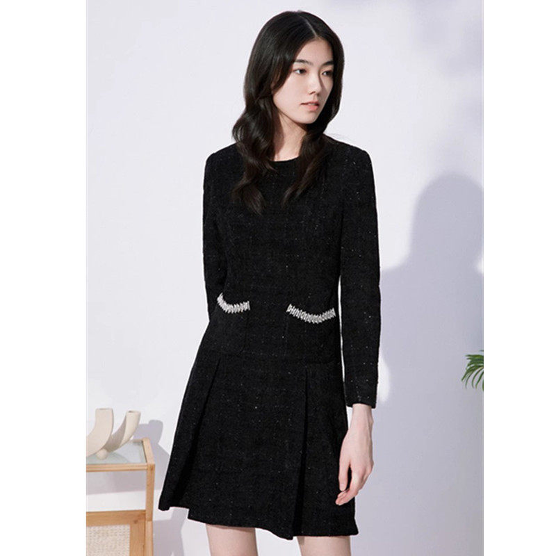 遇见音儿缘2023年秋冬新款钉珠系带粗花呢气质显瘦小香风连衣裙