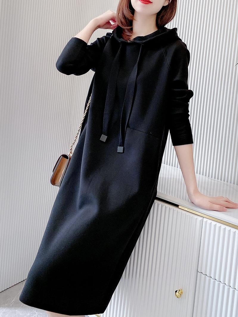 SADO YINER秋季橘红太空棉套头连衣裙长袖休闲宽松过膝连帽卫衣女