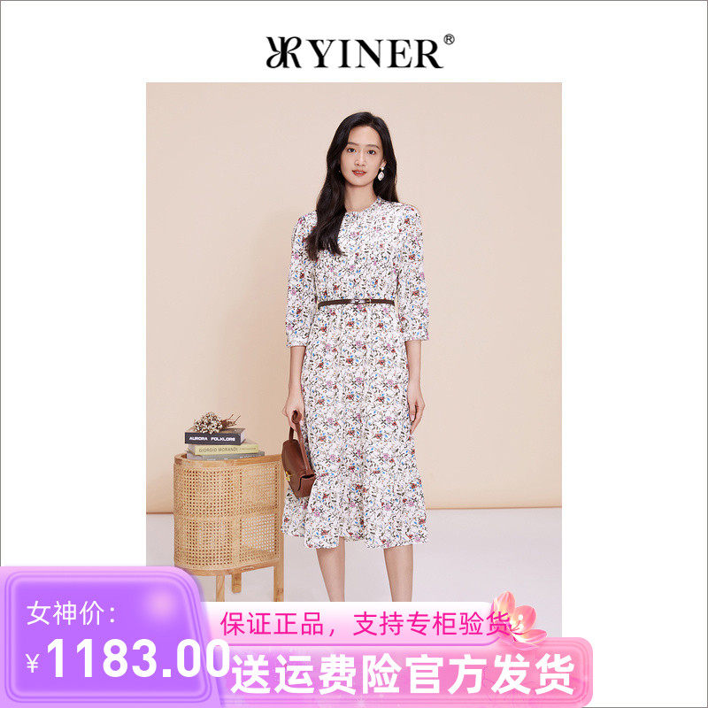 YINER商场同款女装2023春季新款法式印花木耳边连衣裙8C63105066