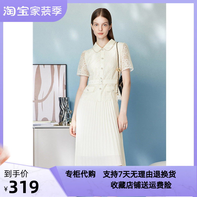 音儿真情女装2023夏新款蕾丝压褶拼接收腰小香风连衣裙