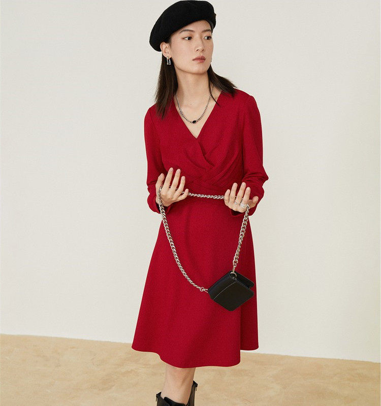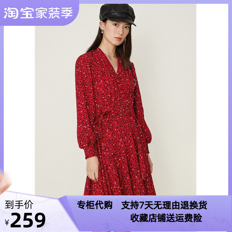 音儿真情女装2022春季新款v领长袖新年红爱心印花连衣裙