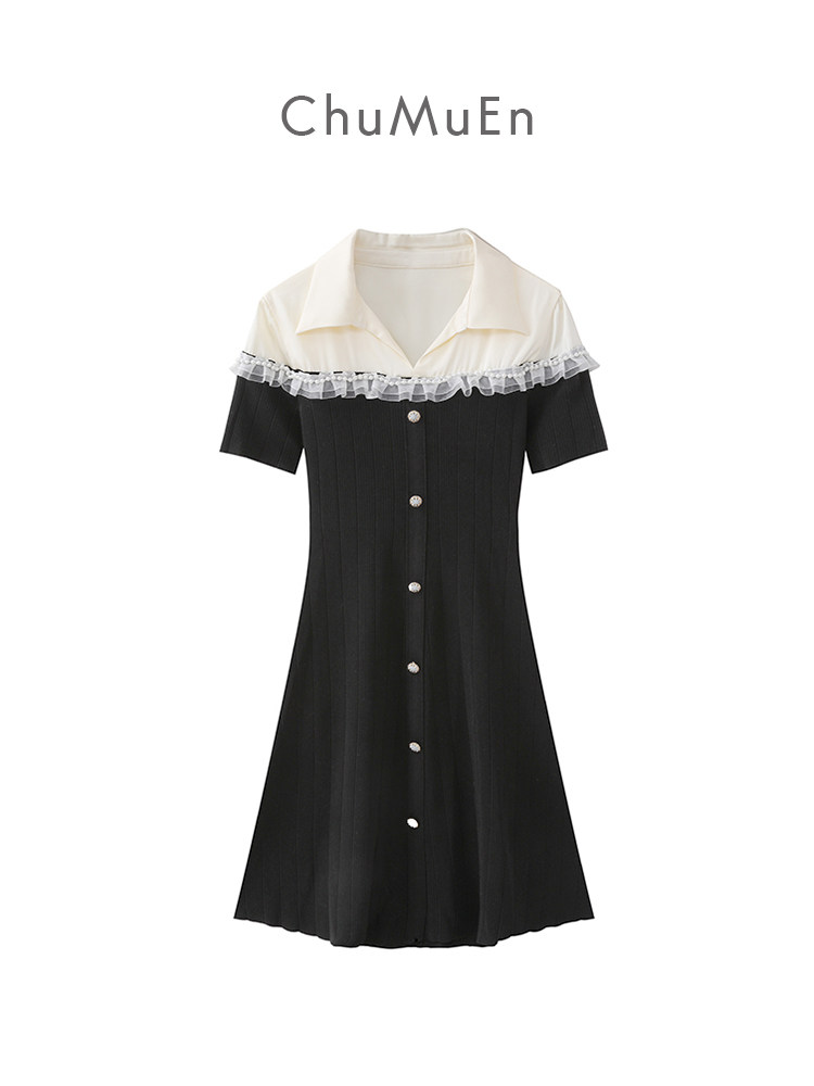 遇见音儿缘2023夏新款假两件黑白拼接法式茶歇荷叶边装饰连衣裙女