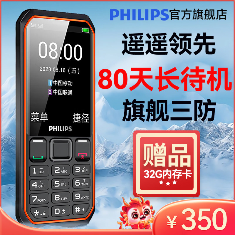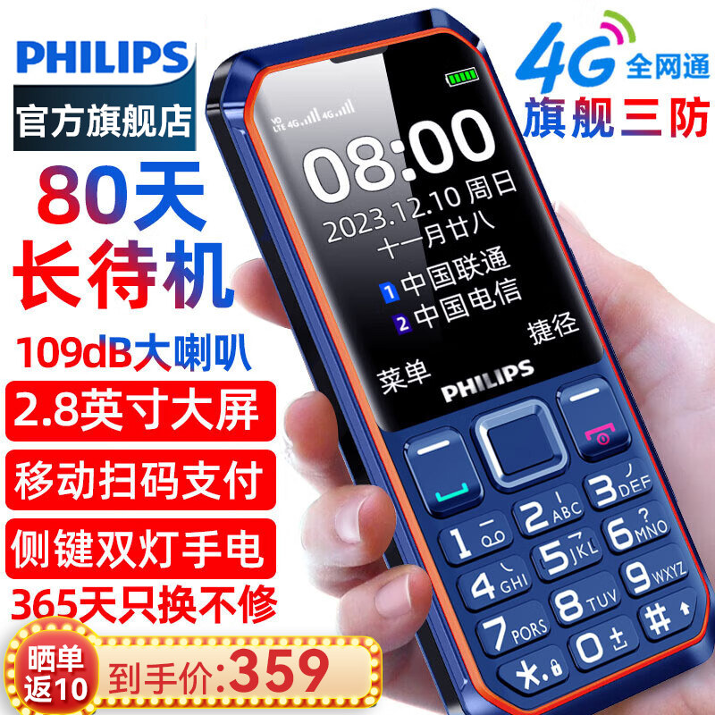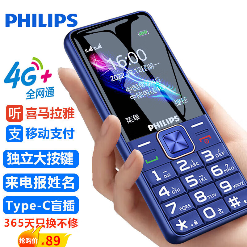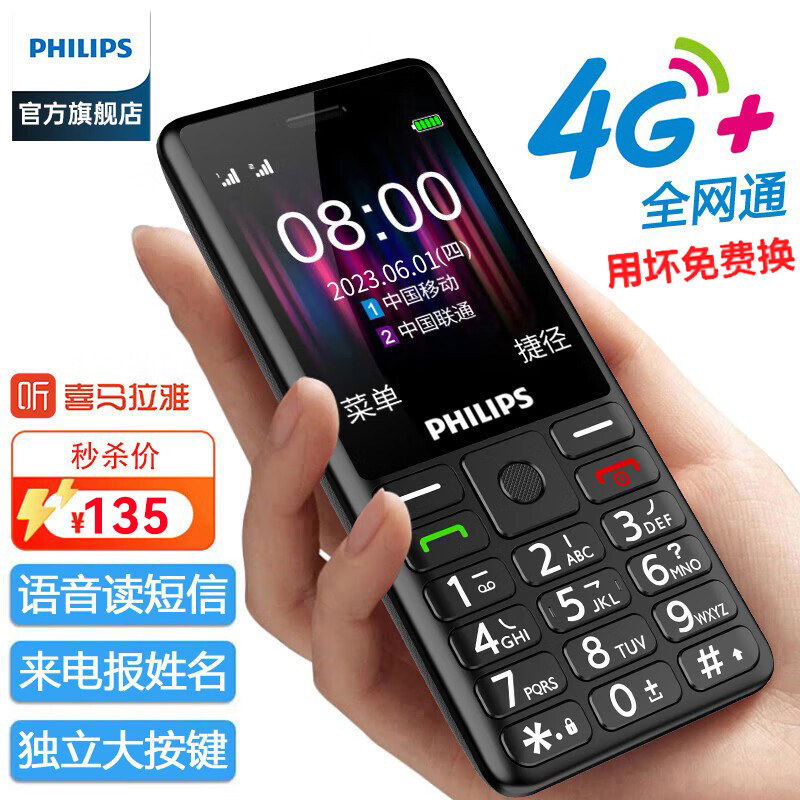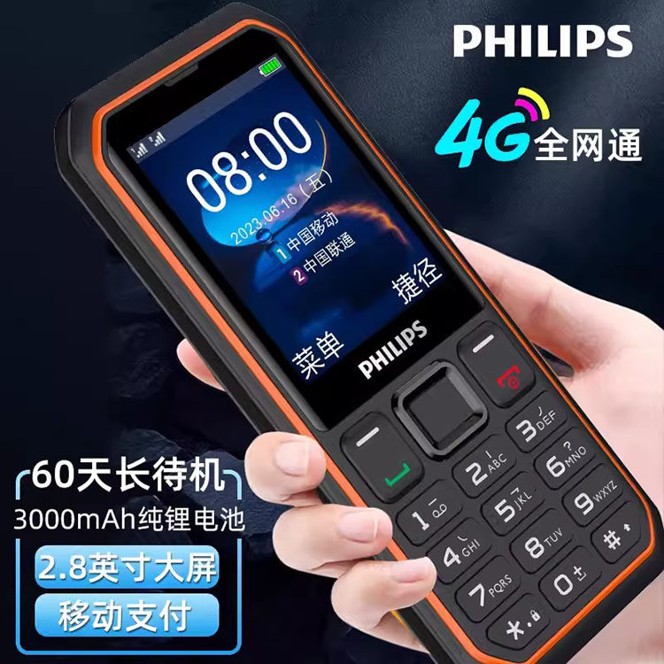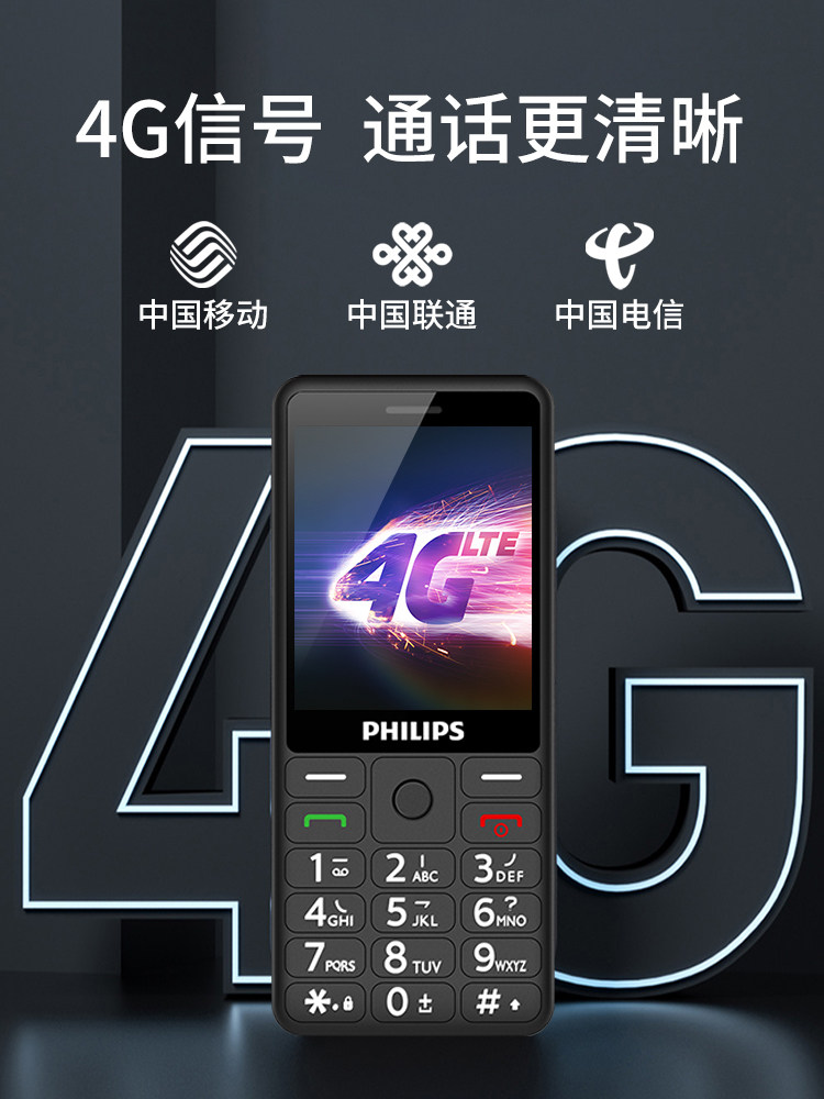 Philips/飞利浦全网通4G老人机超长待机老年手机大屏大字大声音功能备用电信版学生专用非智能按键小手机