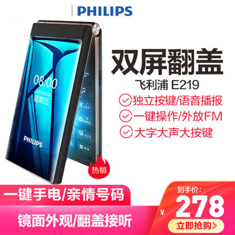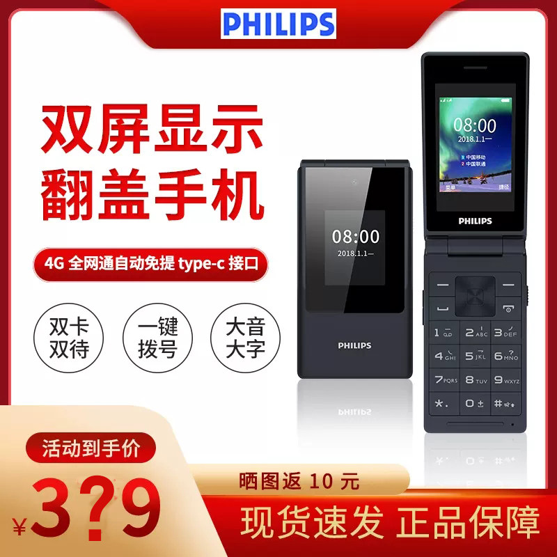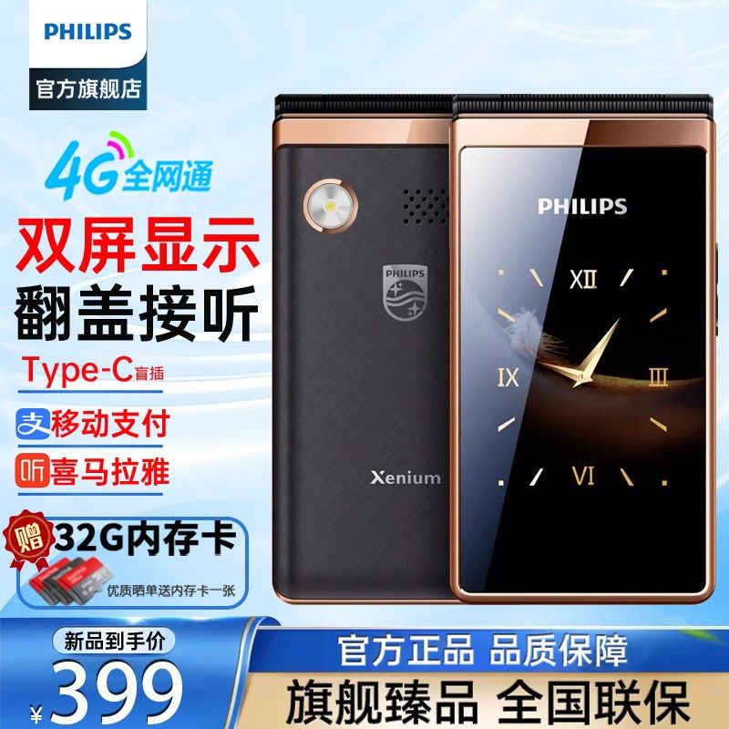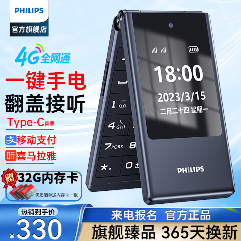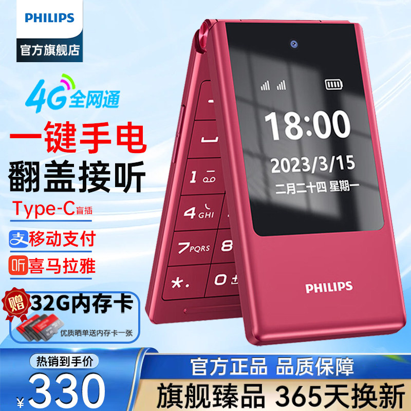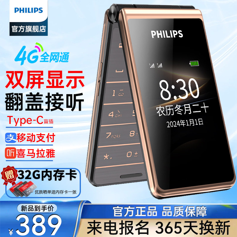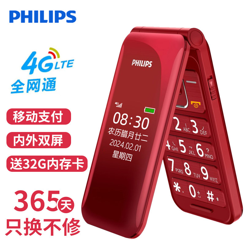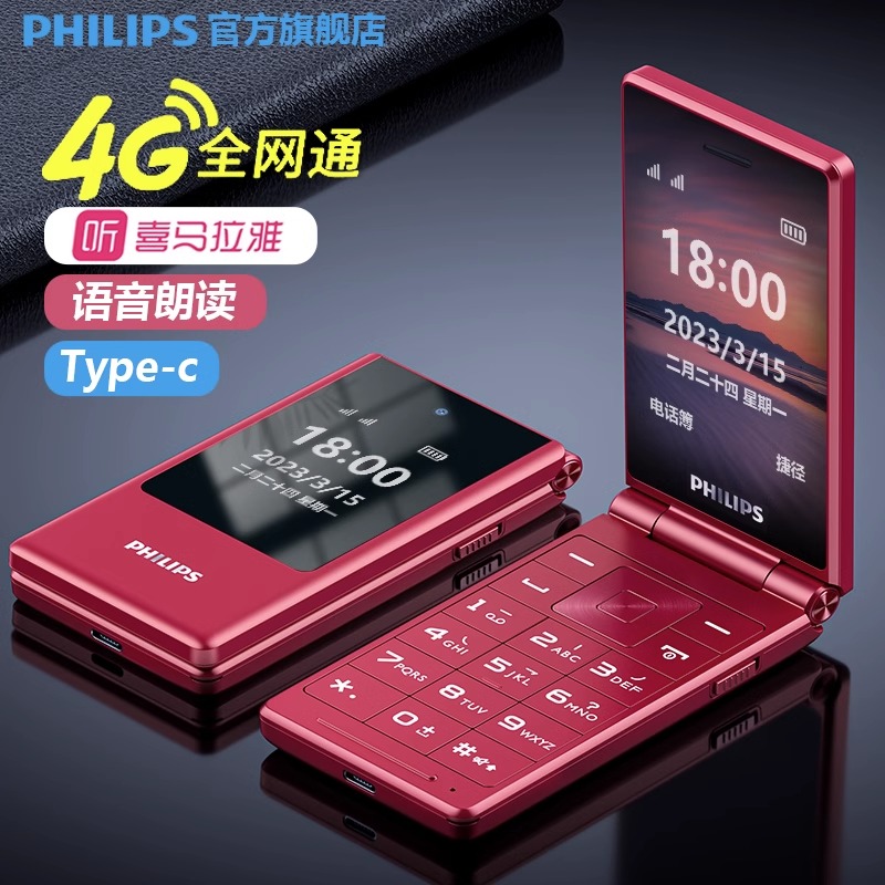 [官方旗舰店]飞利浦旗舰双屏翻盖老年机翻盖接听4G全网通超长待机语音播报老人手机一键拨号大字大声E5356616