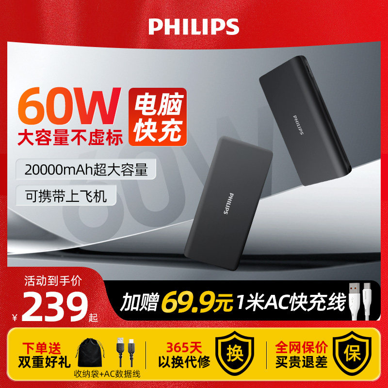 飞利浦充电宝60W大功率20000毫安超大容量小巧便携双向快充移动电源笔记本专用适用苹果15小米华为手机可登机