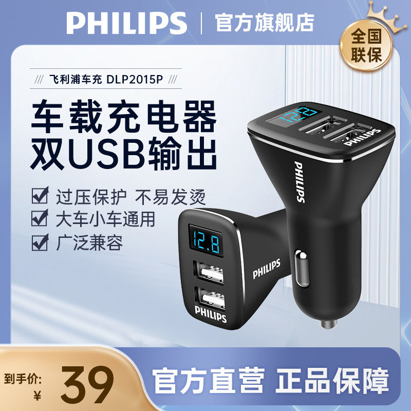 飞利浦车载充电器一拖二苹果安卓华为手机汽车车充双USB扩展口