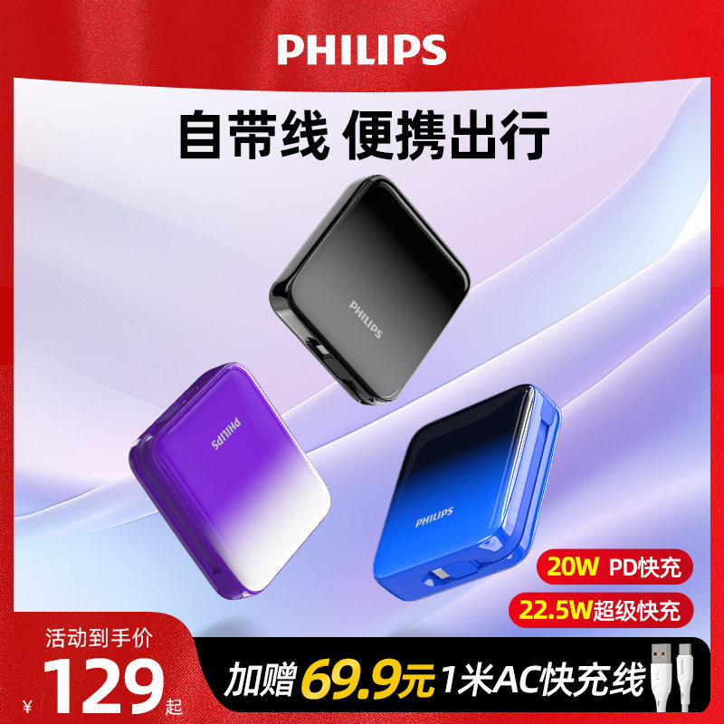 飞利浦充电宝超大容量20000毫安自带线22.5W快充超薄小巧便携双向快充移动电源适用苹果15小米华为手机可登机