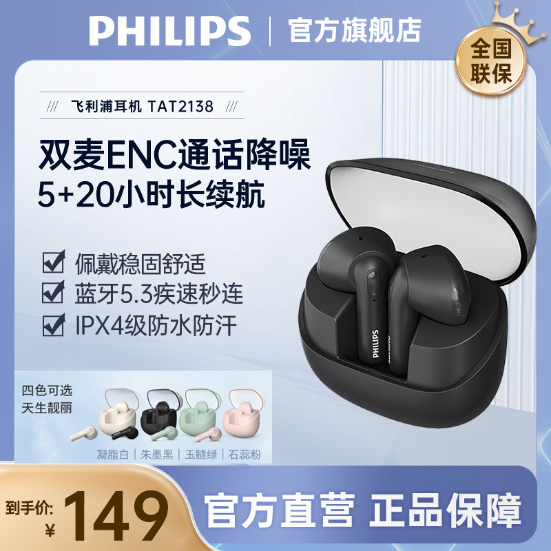 飞利浦TAT2138无线蓝牙半入耳式重低音手机通话降噪超长续航耳机
