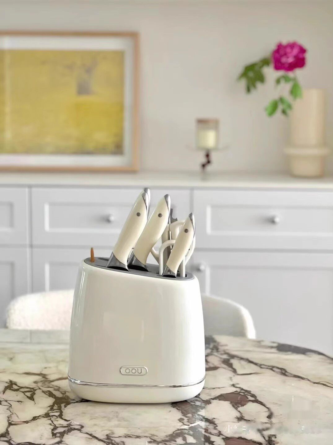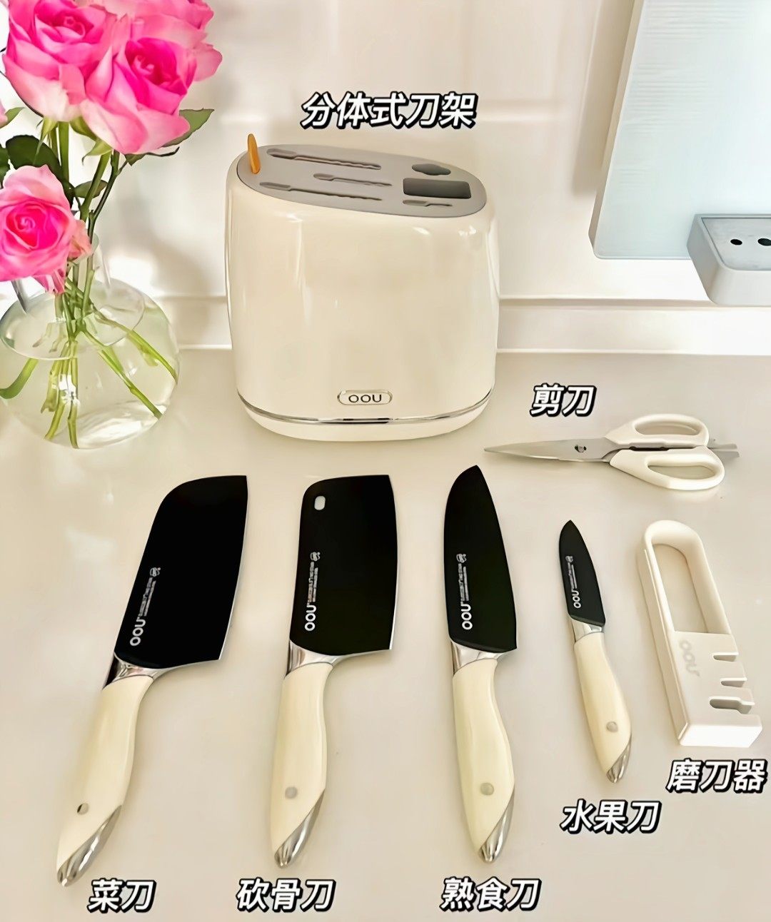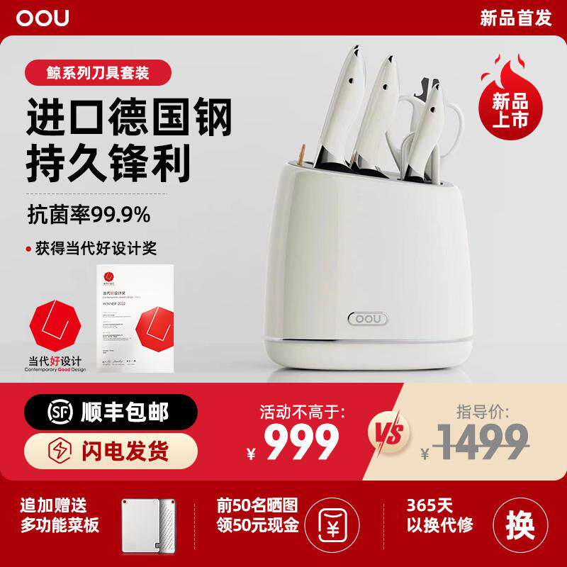OOU白色德国刀具套装厨房厨具菜刀家用切菜板砧板二合一组合刀架