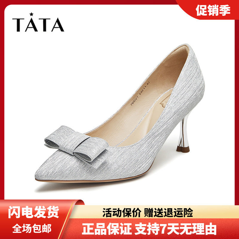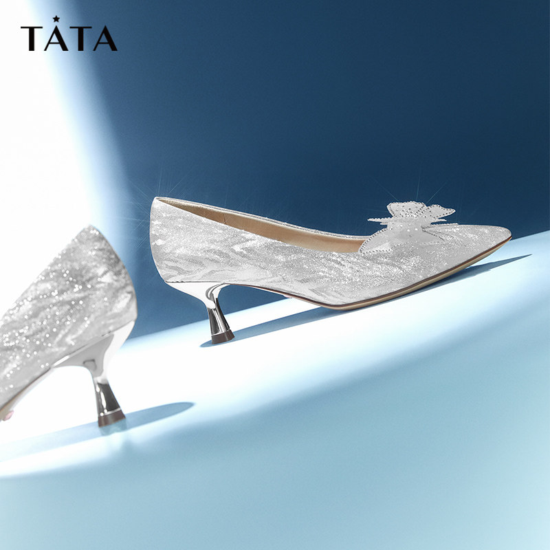 Tata他她法式气质高跟鞋女宴会银色婚鞋细跟单鞋2024春新7DDU6AQ4