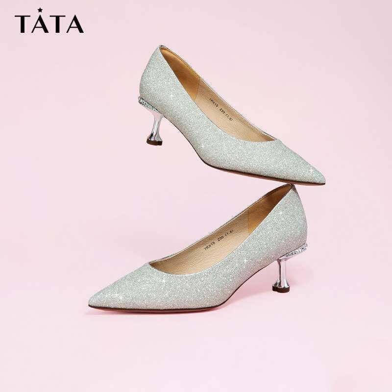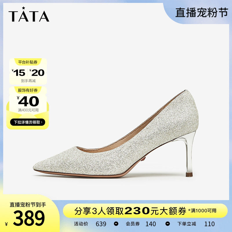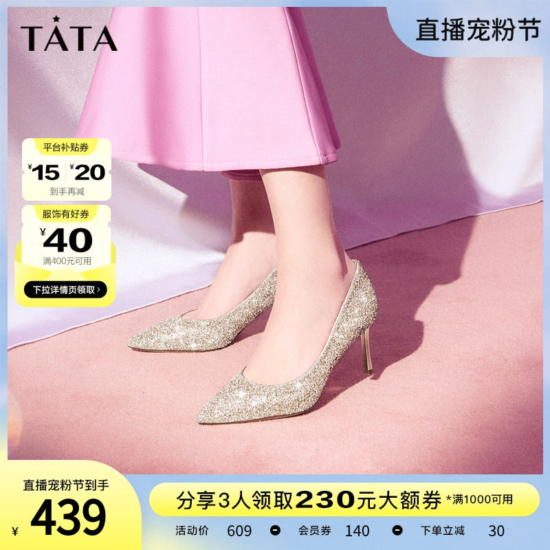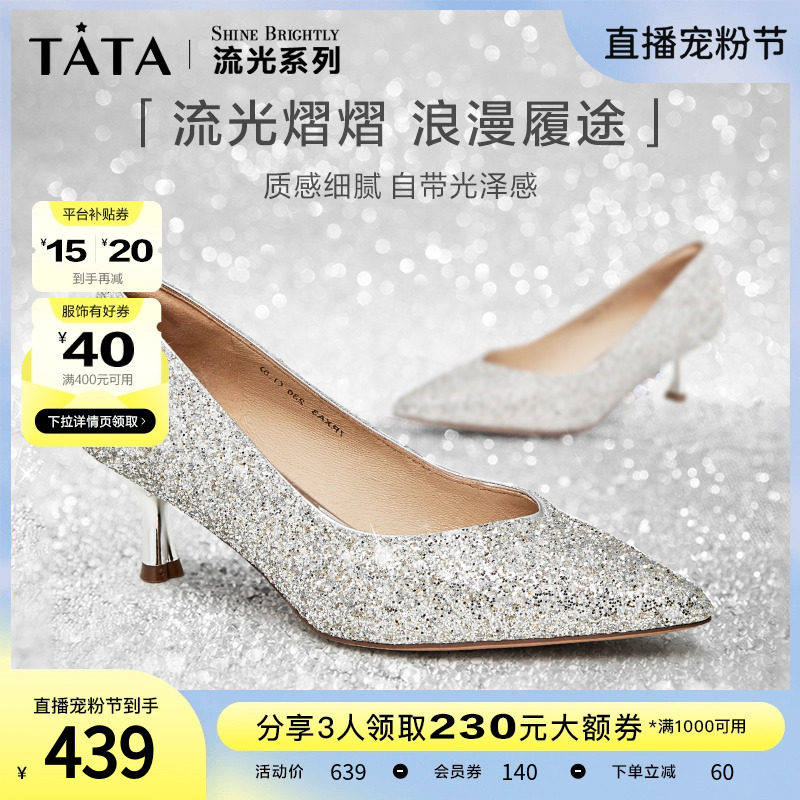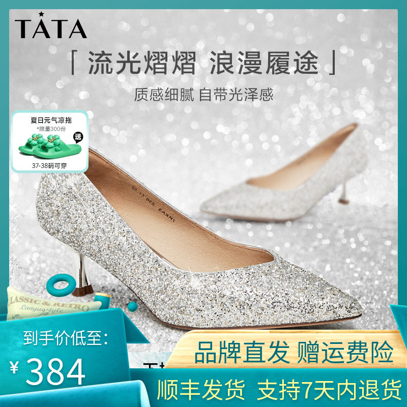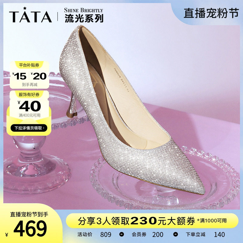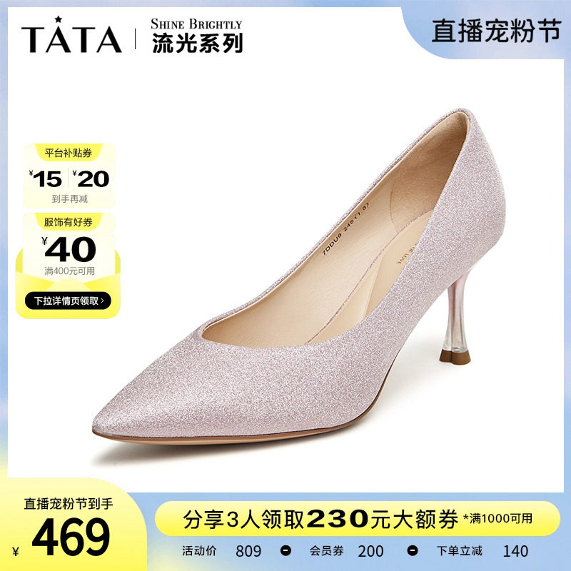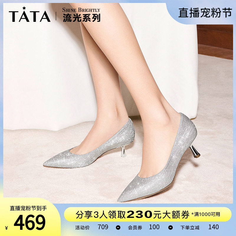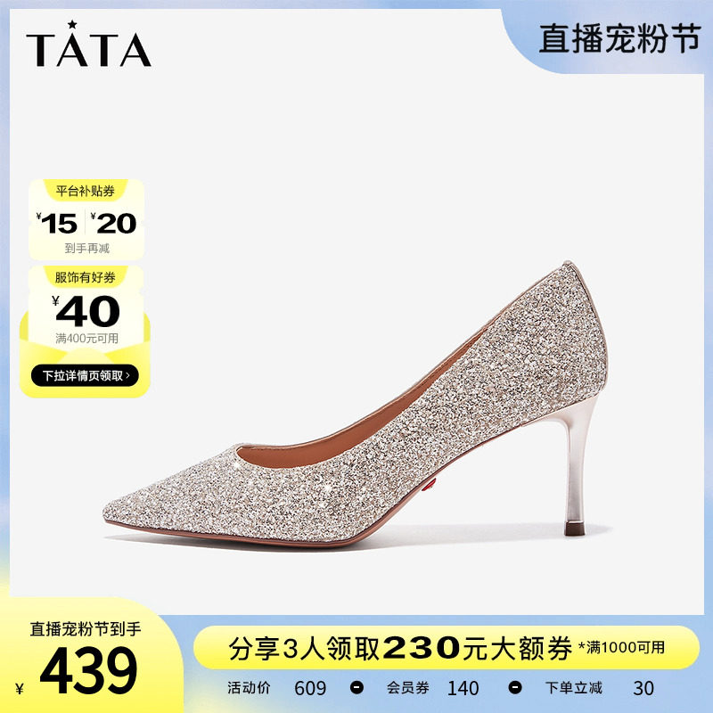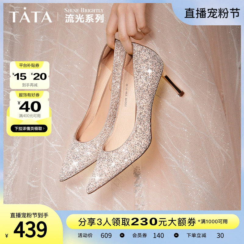 Tata他她法式气质高跟鞋女优雅细闪婚鞋浅口单鞋2024春新7DDU9AQ4
