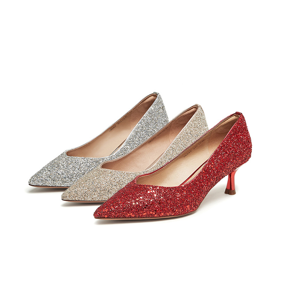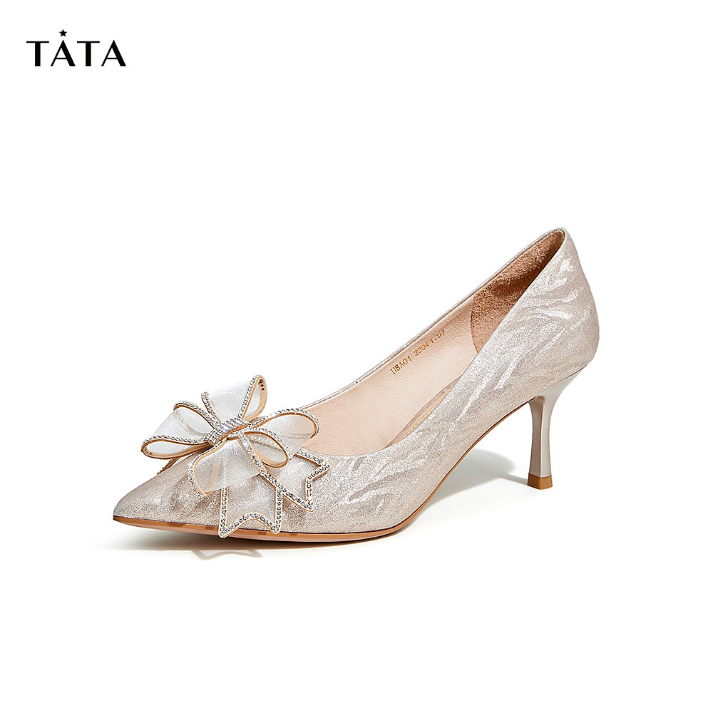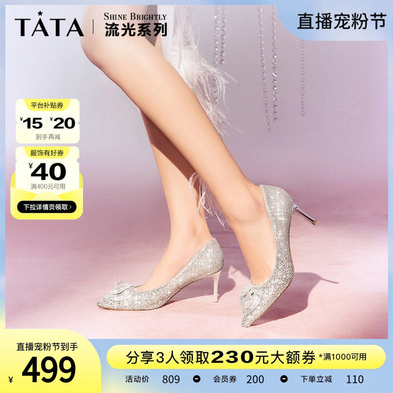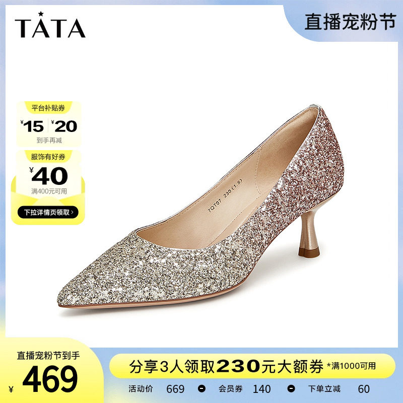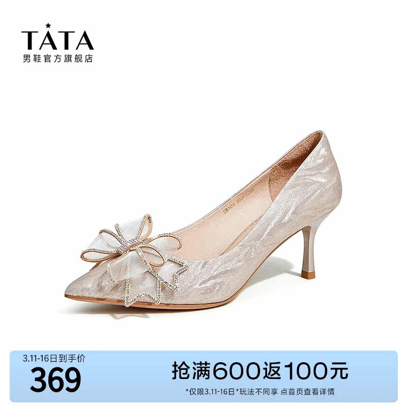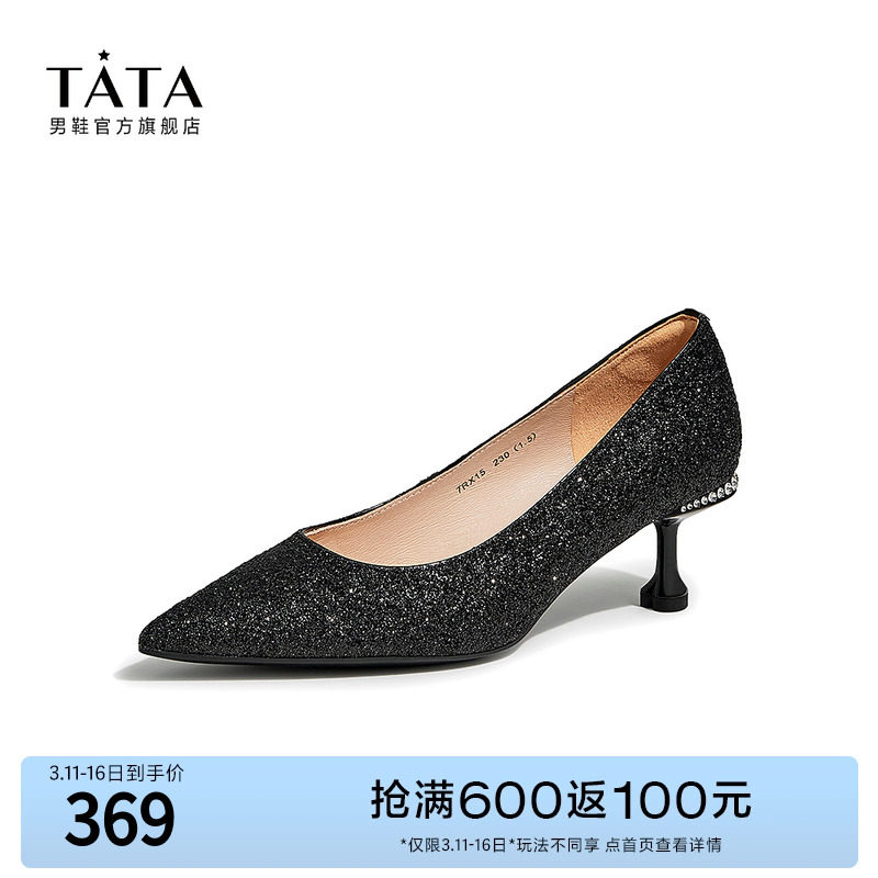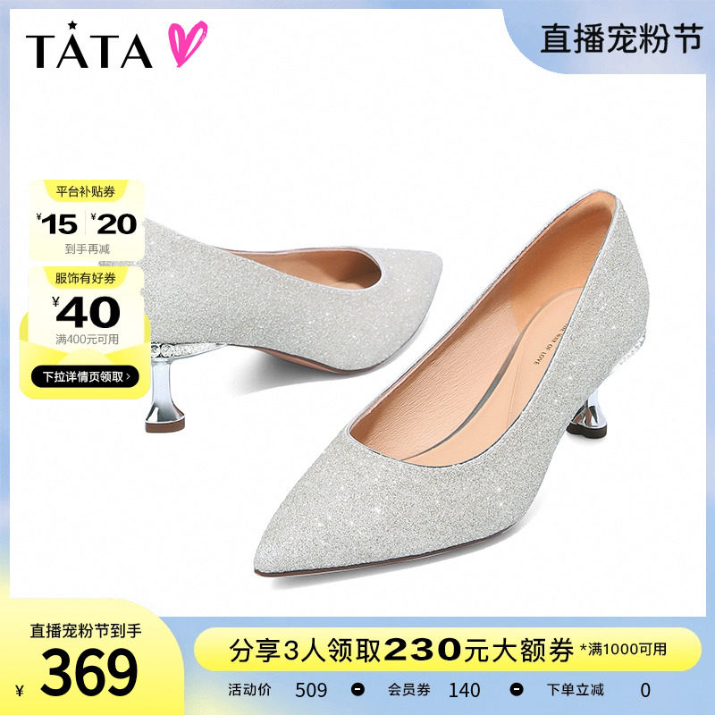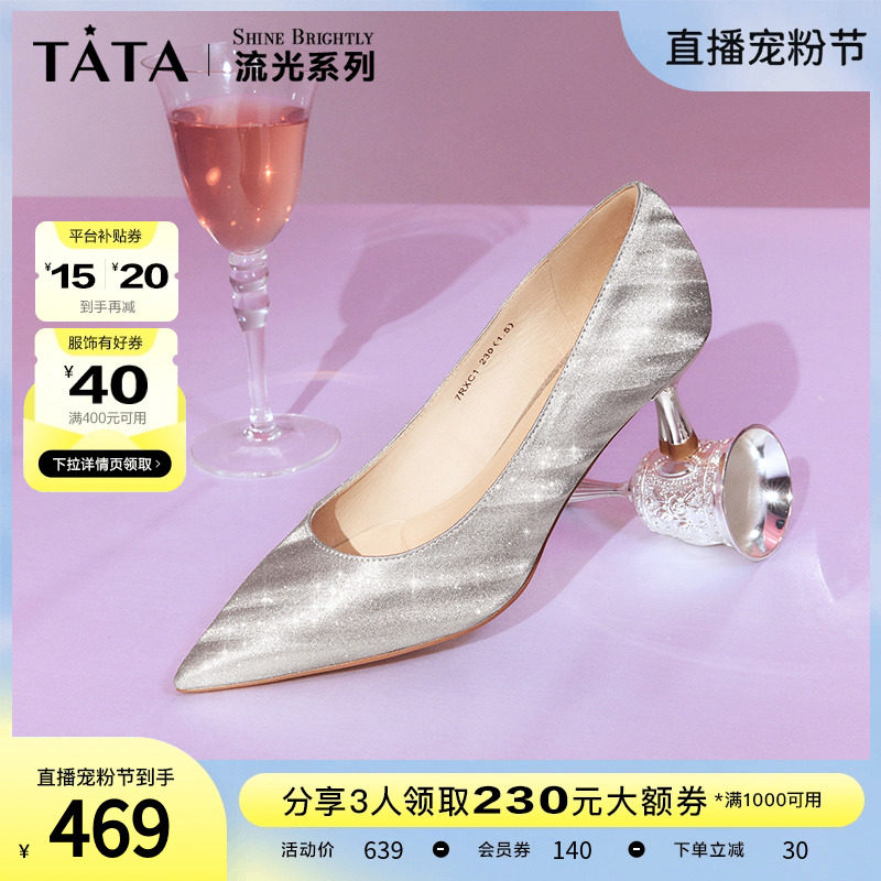 Tata他她法式气质高跟鞋女优雅细闪婚鞋浅口单鞋2024春新7DDU9AQ4