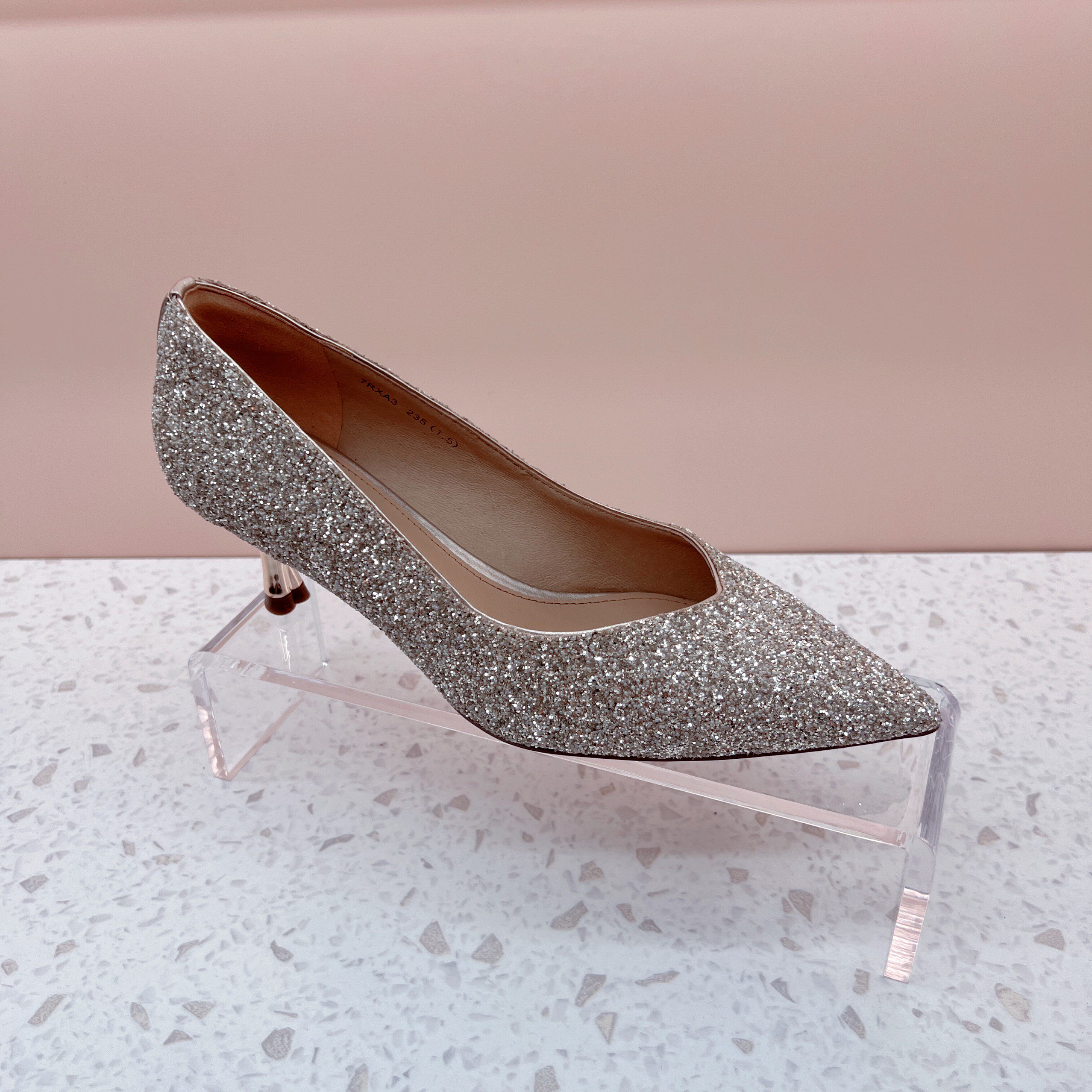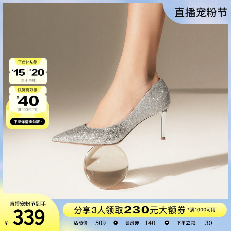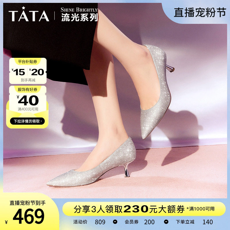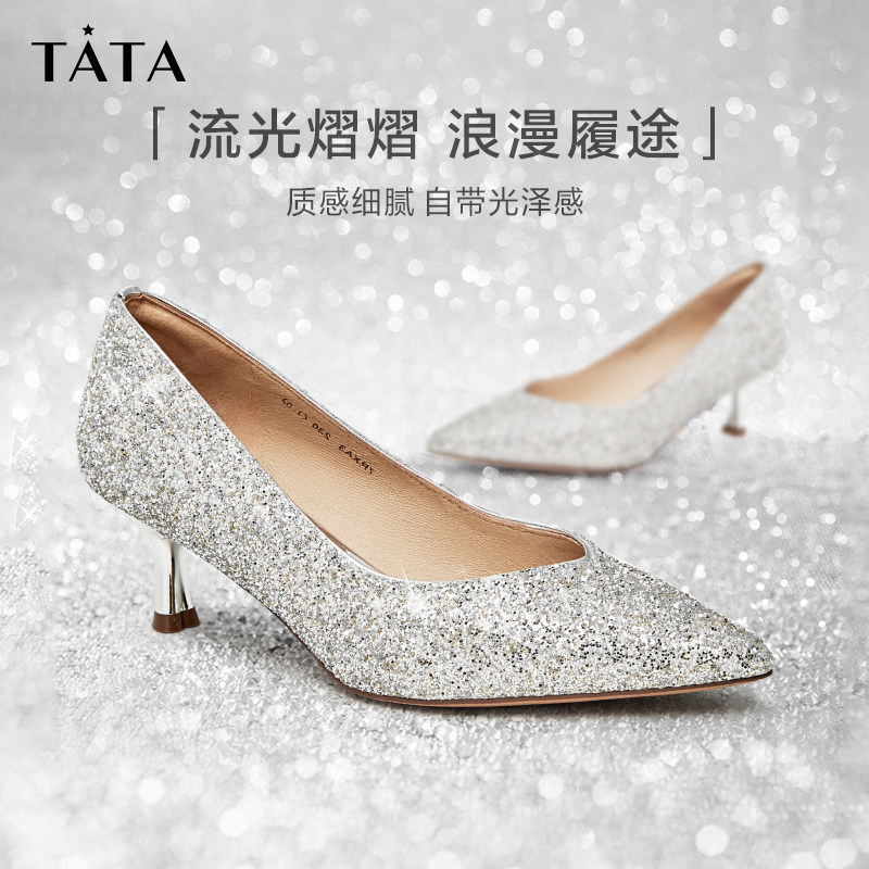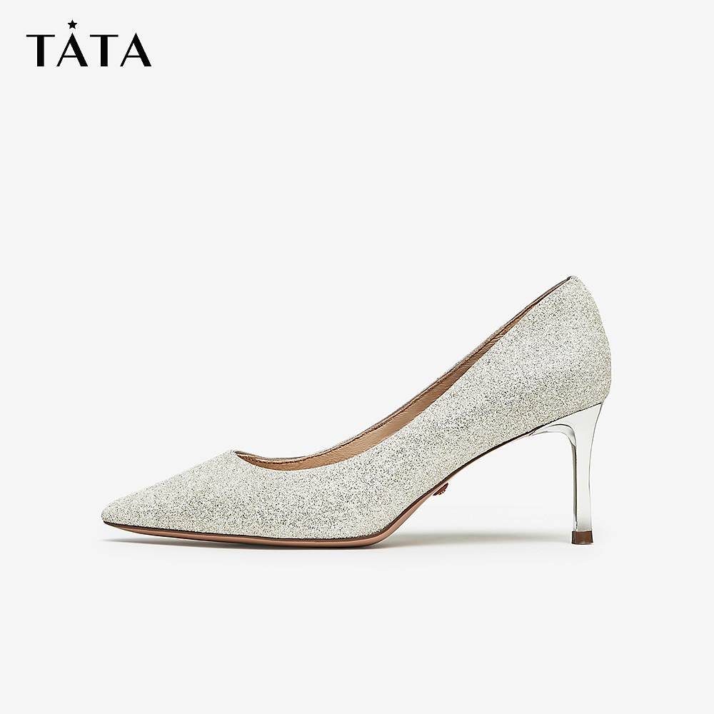 Tata他她2023秋新款银色高跟鞋女细跟百搭不累脚婚鞋女闪亮7RXA3