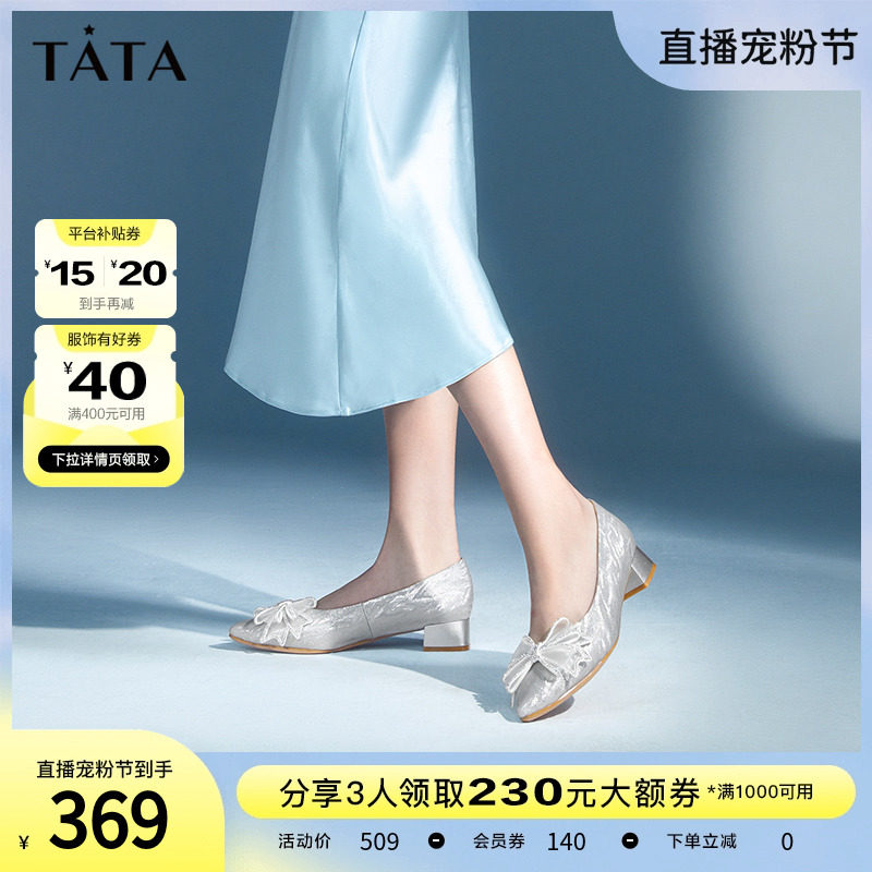 Tata他她蝴蝶结粗跟婚鞋女尖头晚晚鞋法式单鞋2023春新款UAW01AQ3