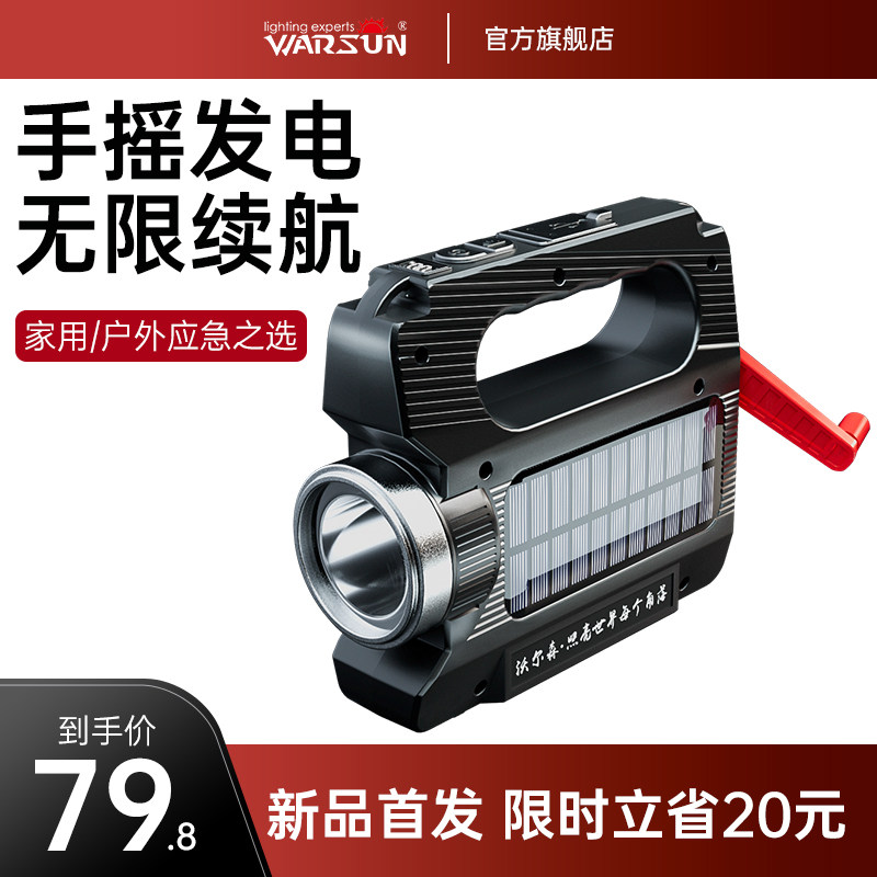 沃尔森手电筒强光充电超亮户外手提远射应急照明巡逻太阳能探照灯