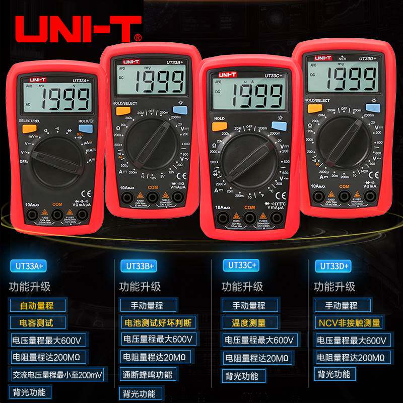 优利德UT33D+数字万用表高精度全自动防烧便携小型电容电阻蜂鸣器